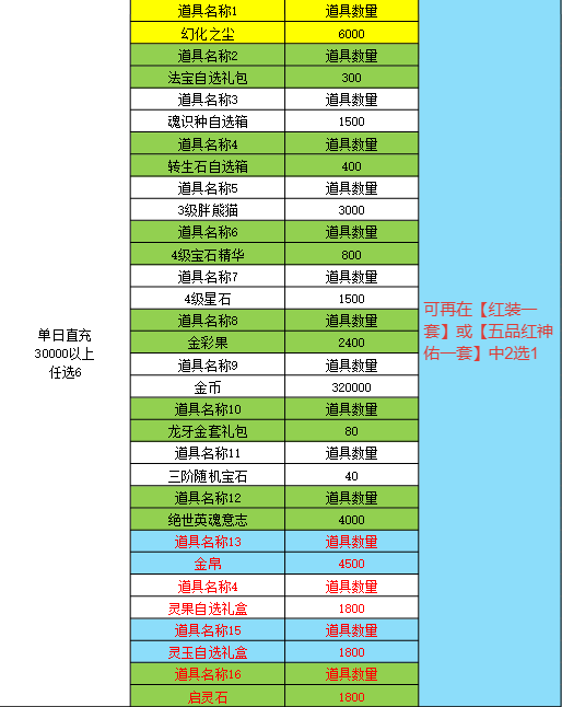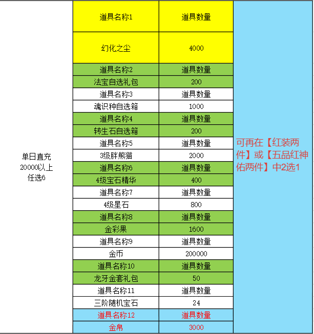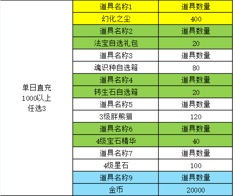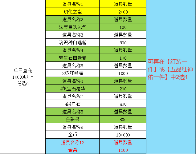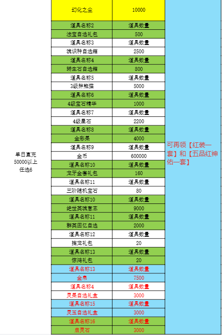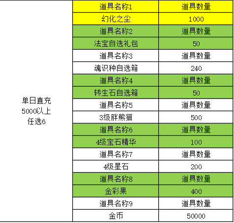 4.单次充值5万以上,按5万比率增加道具类型,不新增道具种类